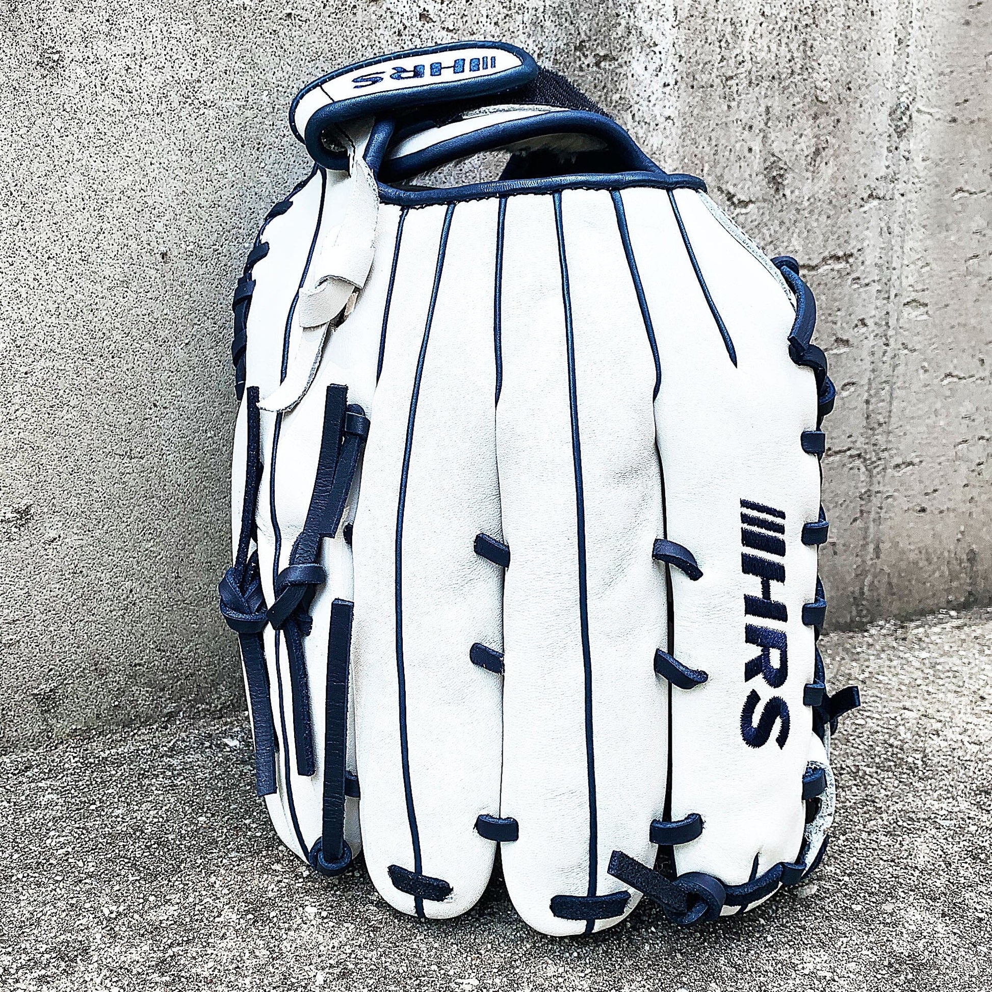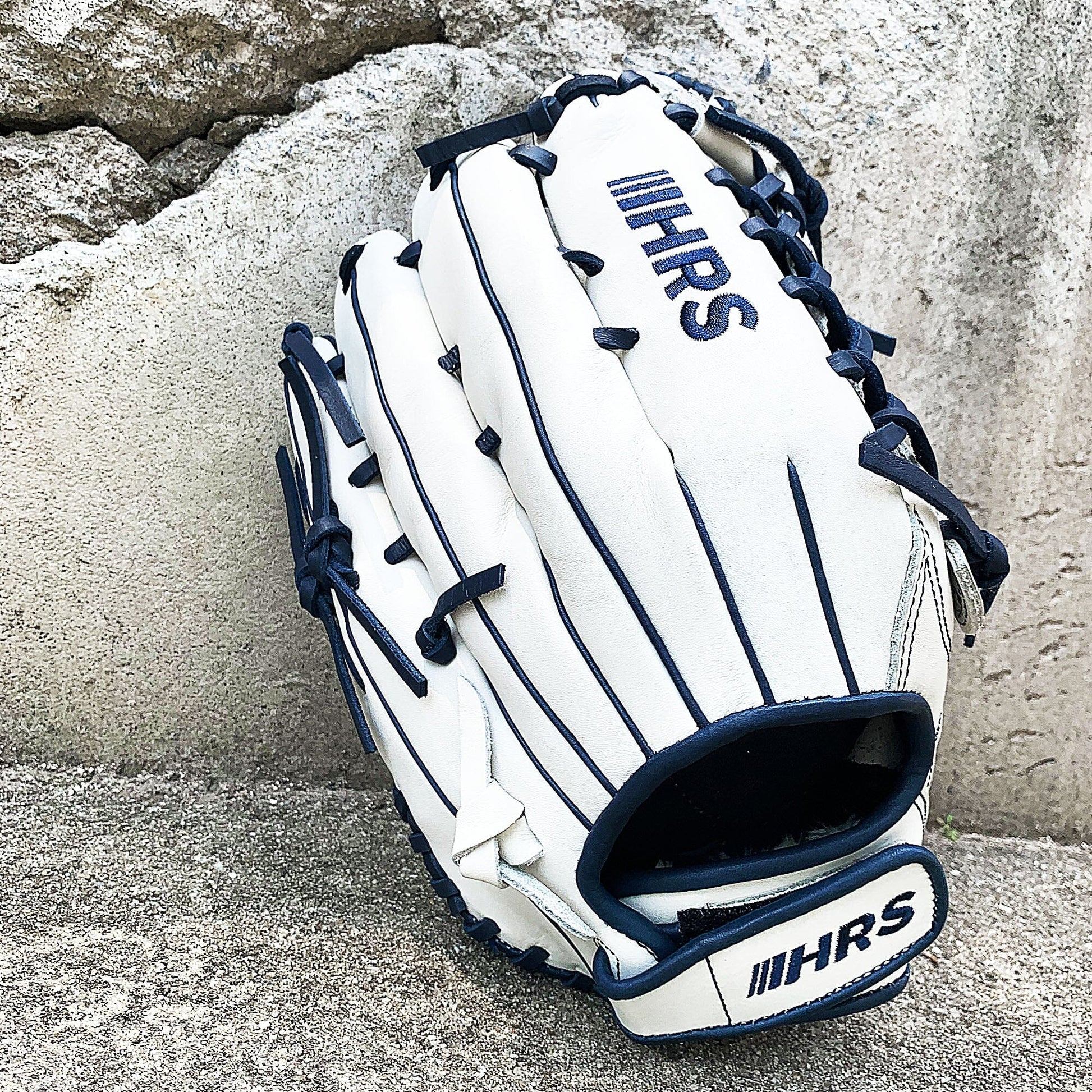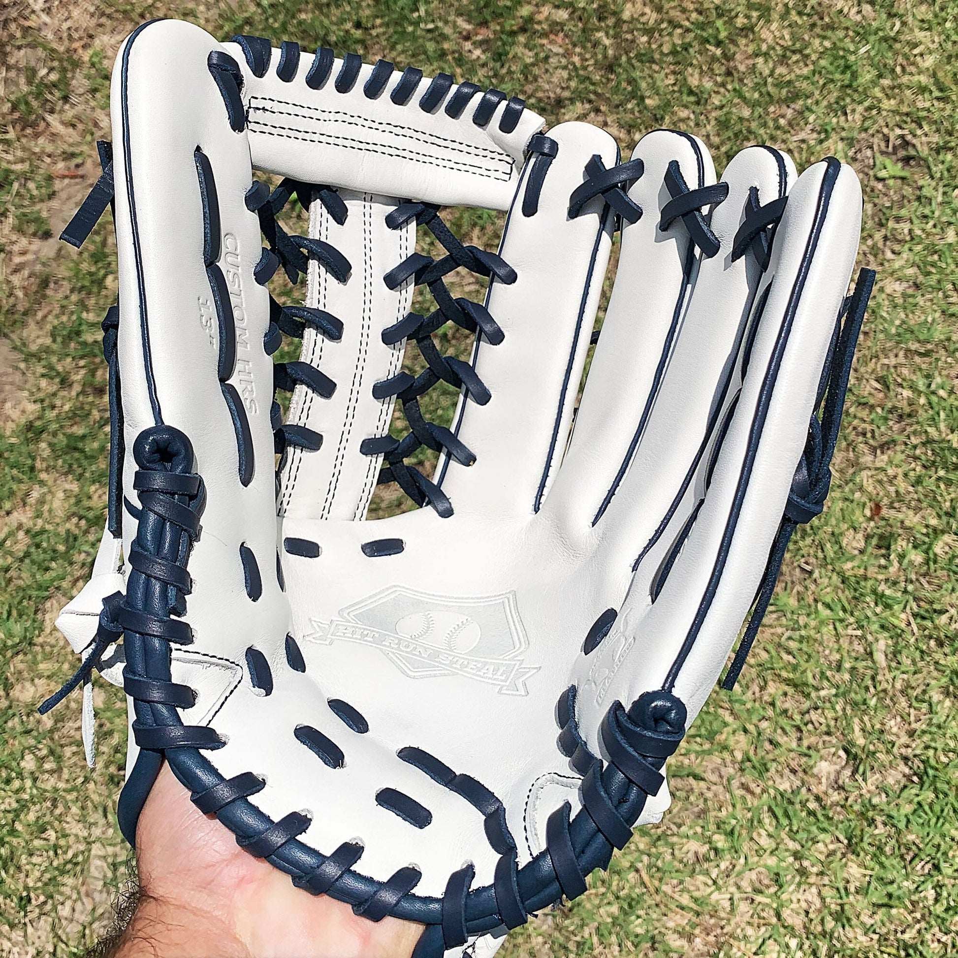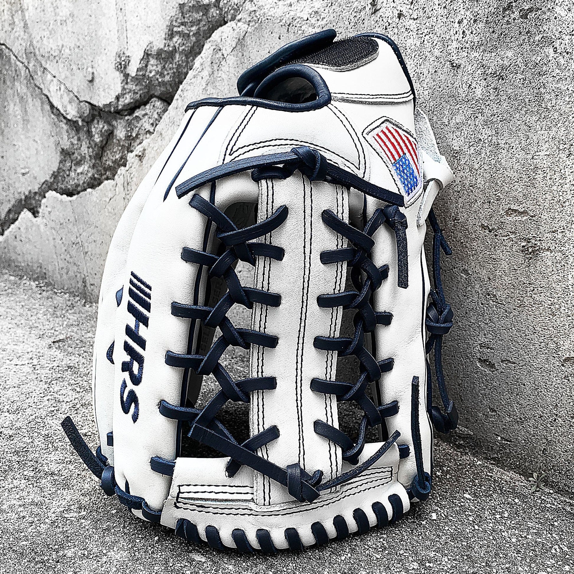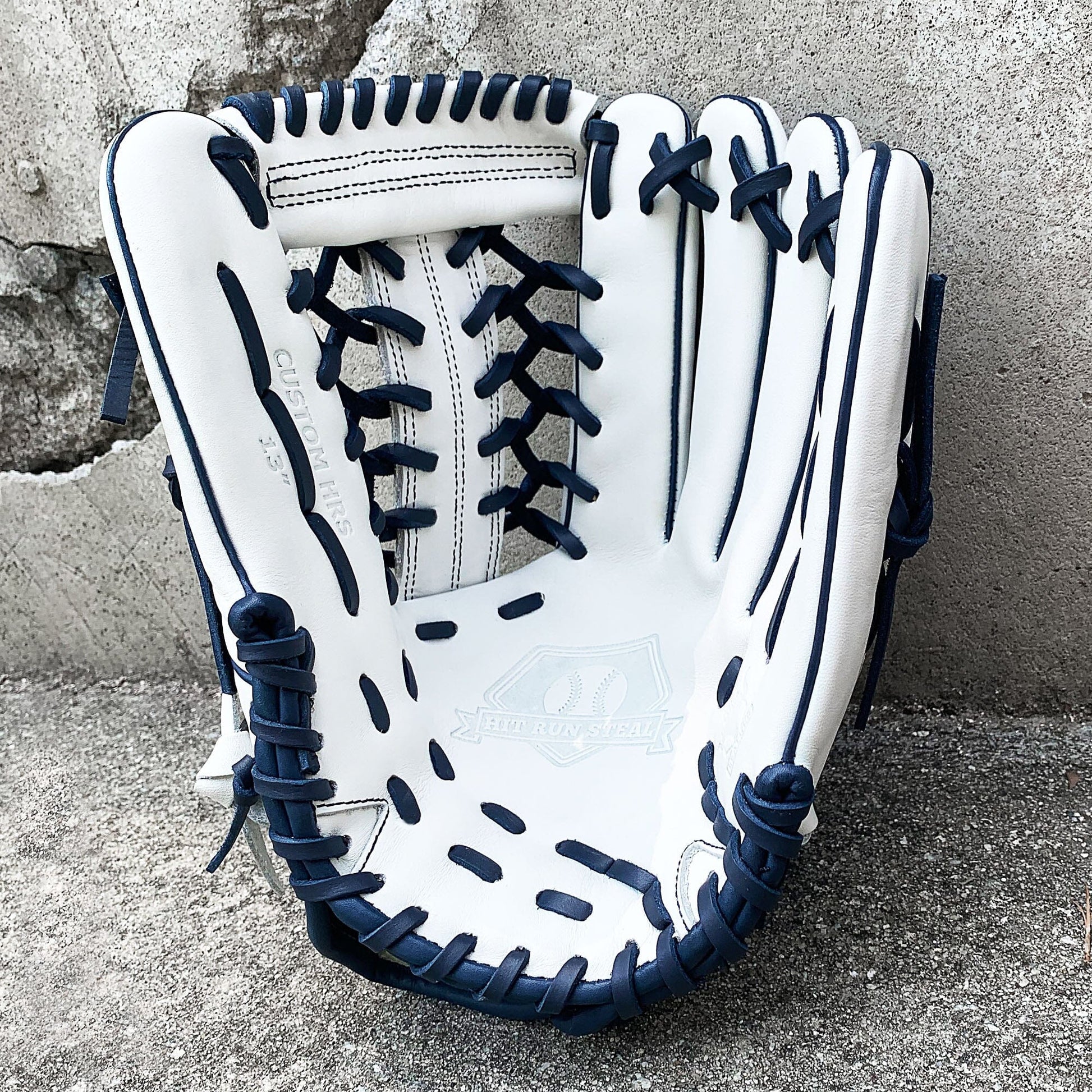 The 13 inch softball mitt is a showstopper with our most popular modified trap web, and white and navy colorway