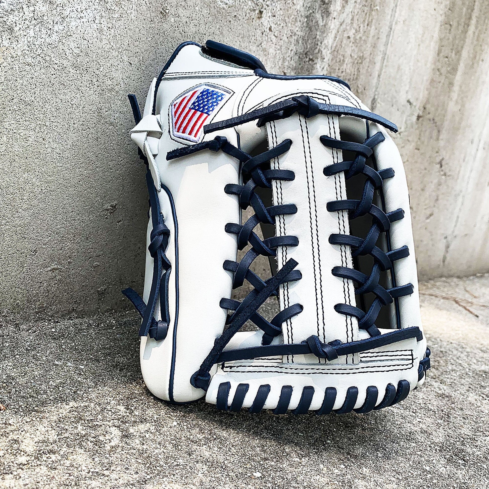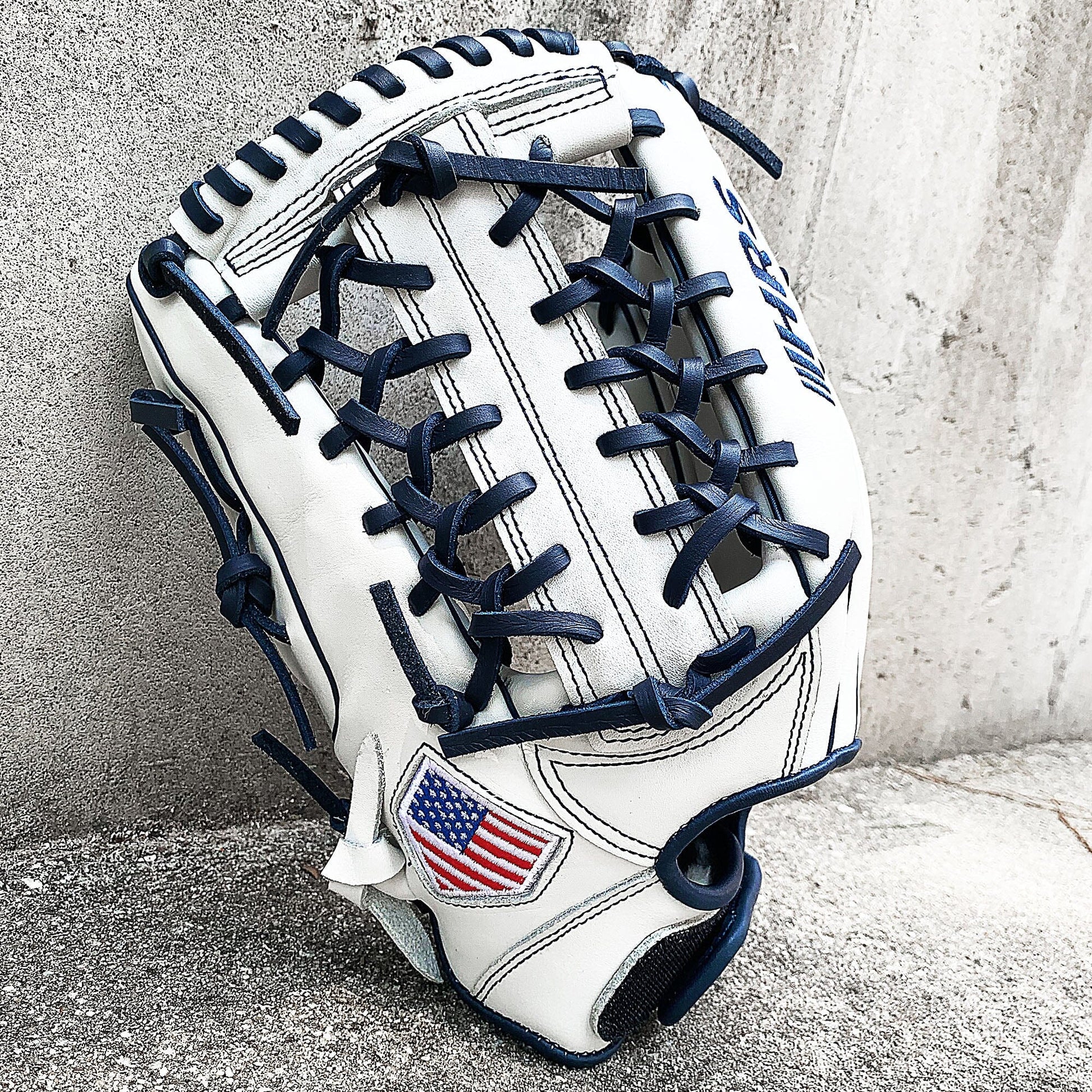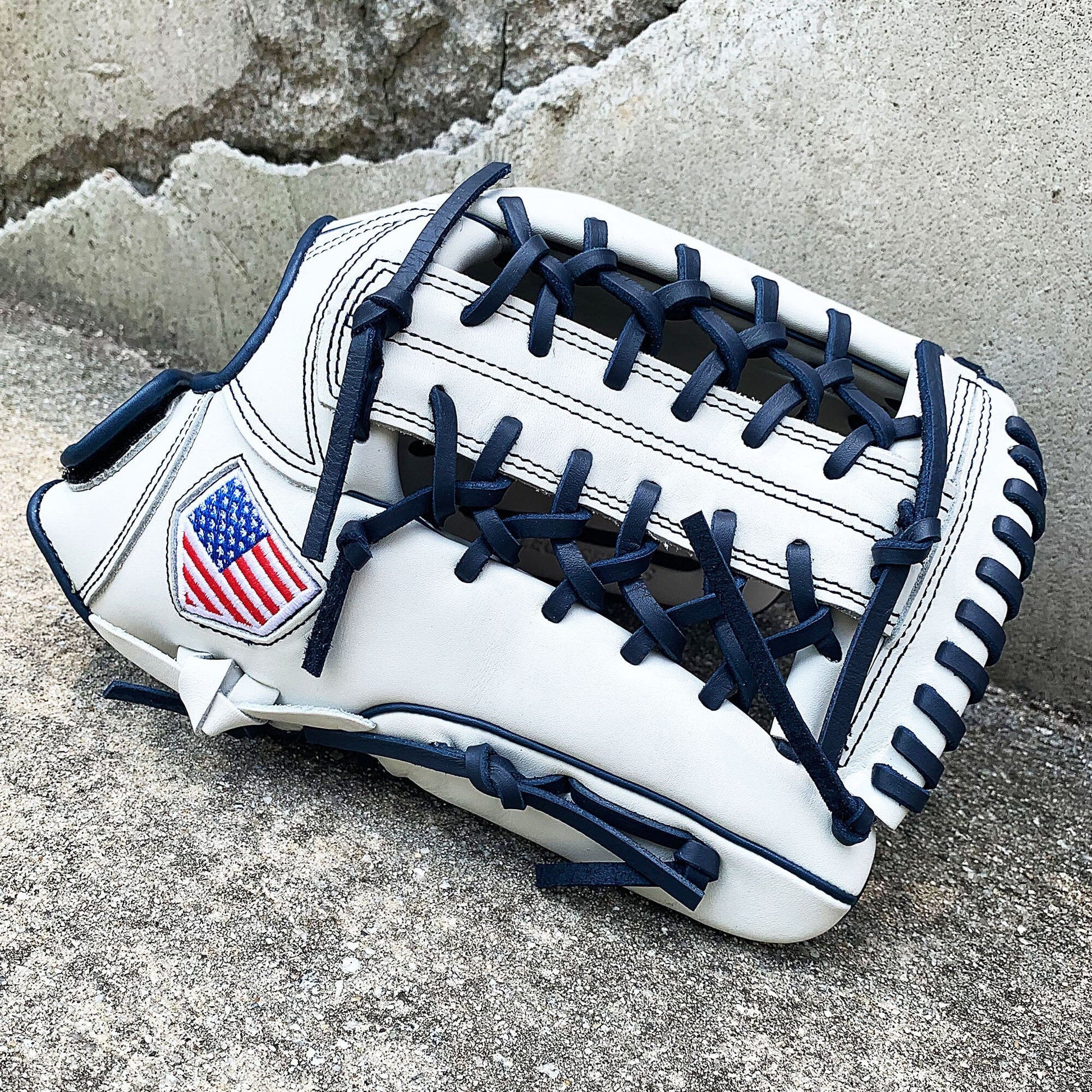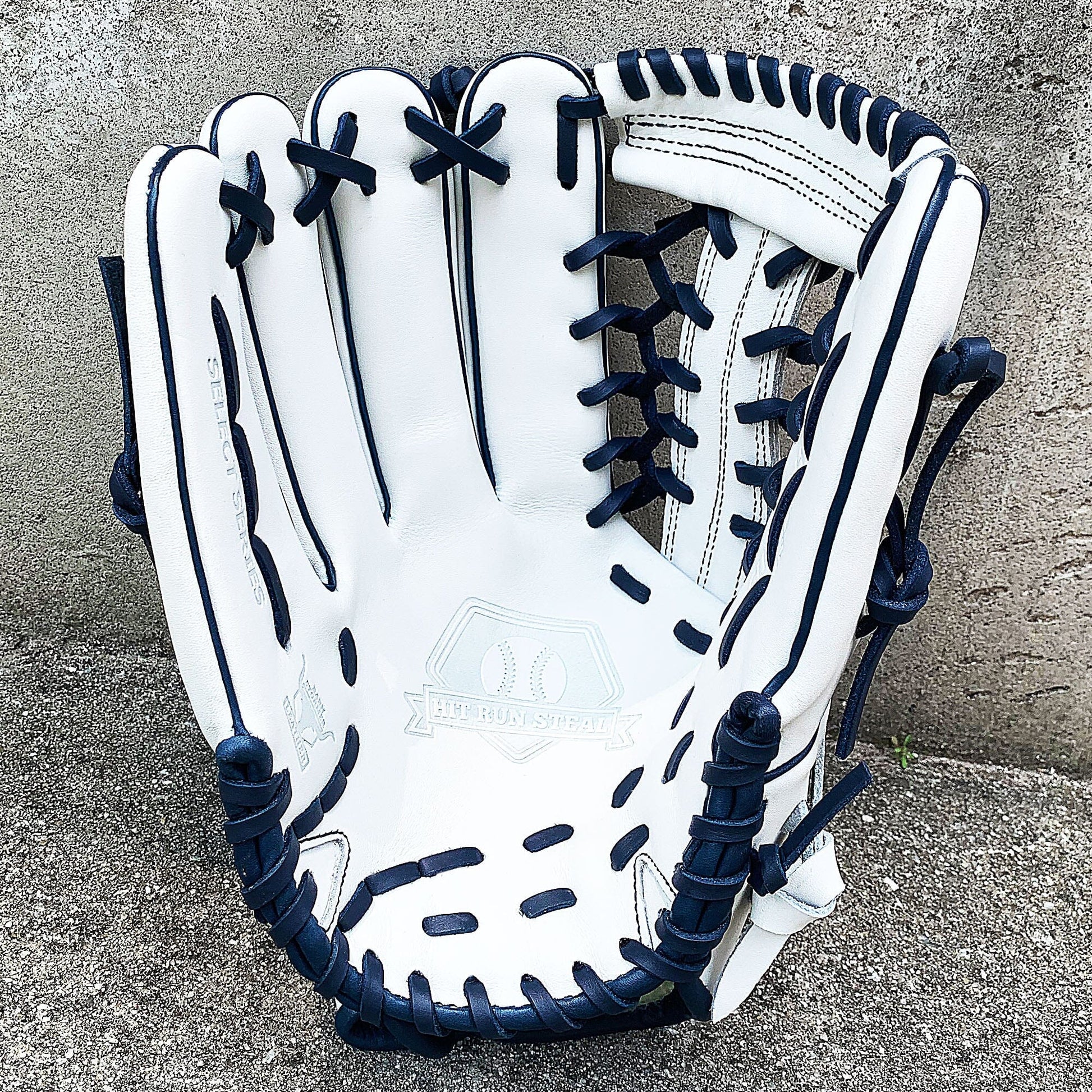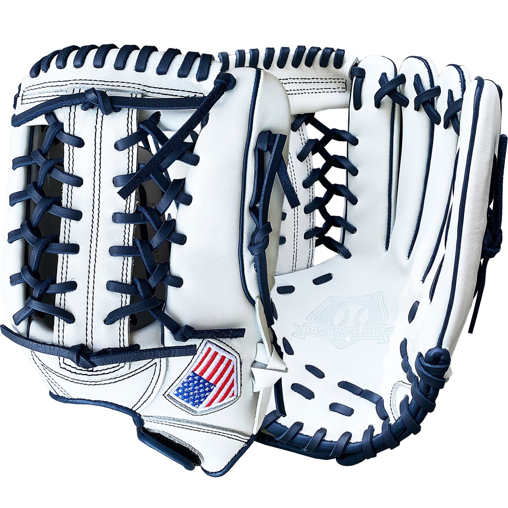The 13 inch softball mitt is a showstopper with our most popular modified trap web, and white and navy colorway