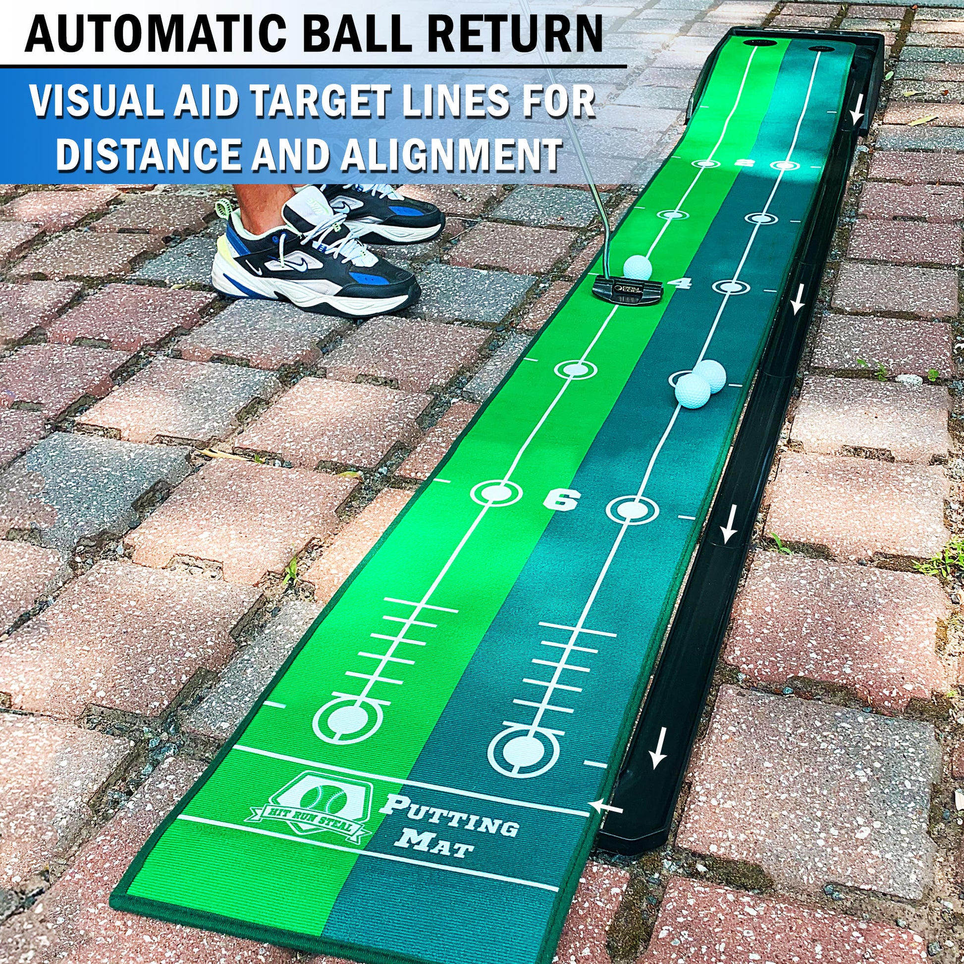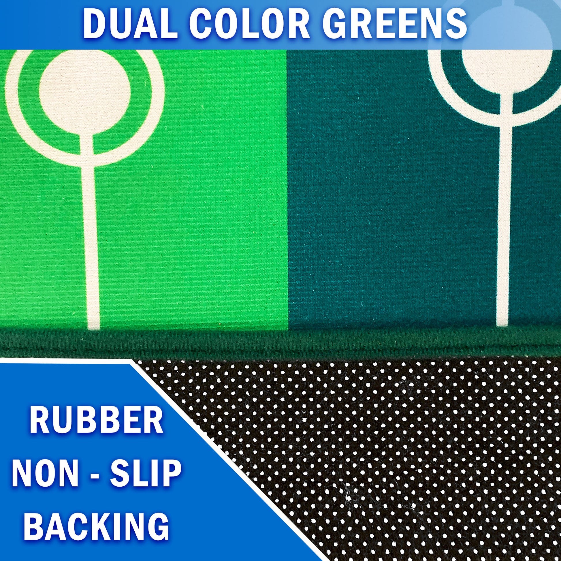• Dual color real synthetic turf simulation with visual aid target lines to improve alignment